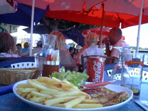 20:00 港の横に並んだCafeでお食事。ビールとワインがすごくおいしい。