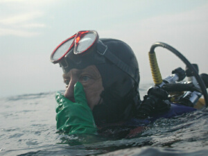スーツは6ミリのフード付き2ピース。ほとんどドライスーツ状態。