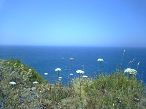 ちょうどそこはきのう海から見上げた赤灯台があった。海は白波がたってる。ここから見るとすごく