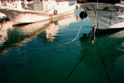 港の船をつないでいるロープに手のひらサイズのつばめうおが 7匹集まって